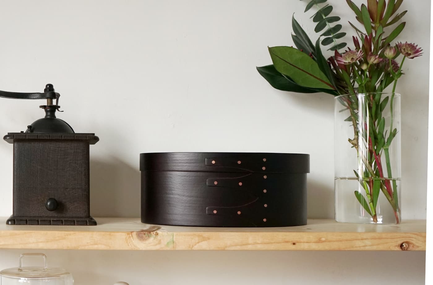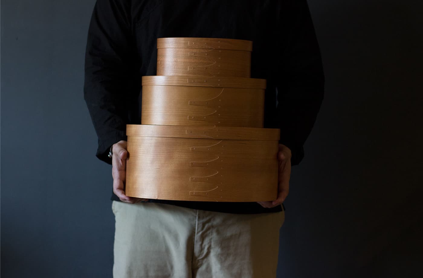 一見「曲げわっぱ」に見えるシェーカーボックスですが、もともと19 世紀にキリスト教プロテスタント派のシェーカー教徒たちによって作られた木製品のひとつ。